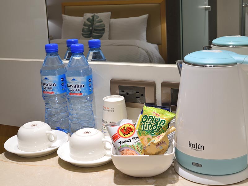- Mineral Water, Coffee Bags, Tea Bags, Snacks
